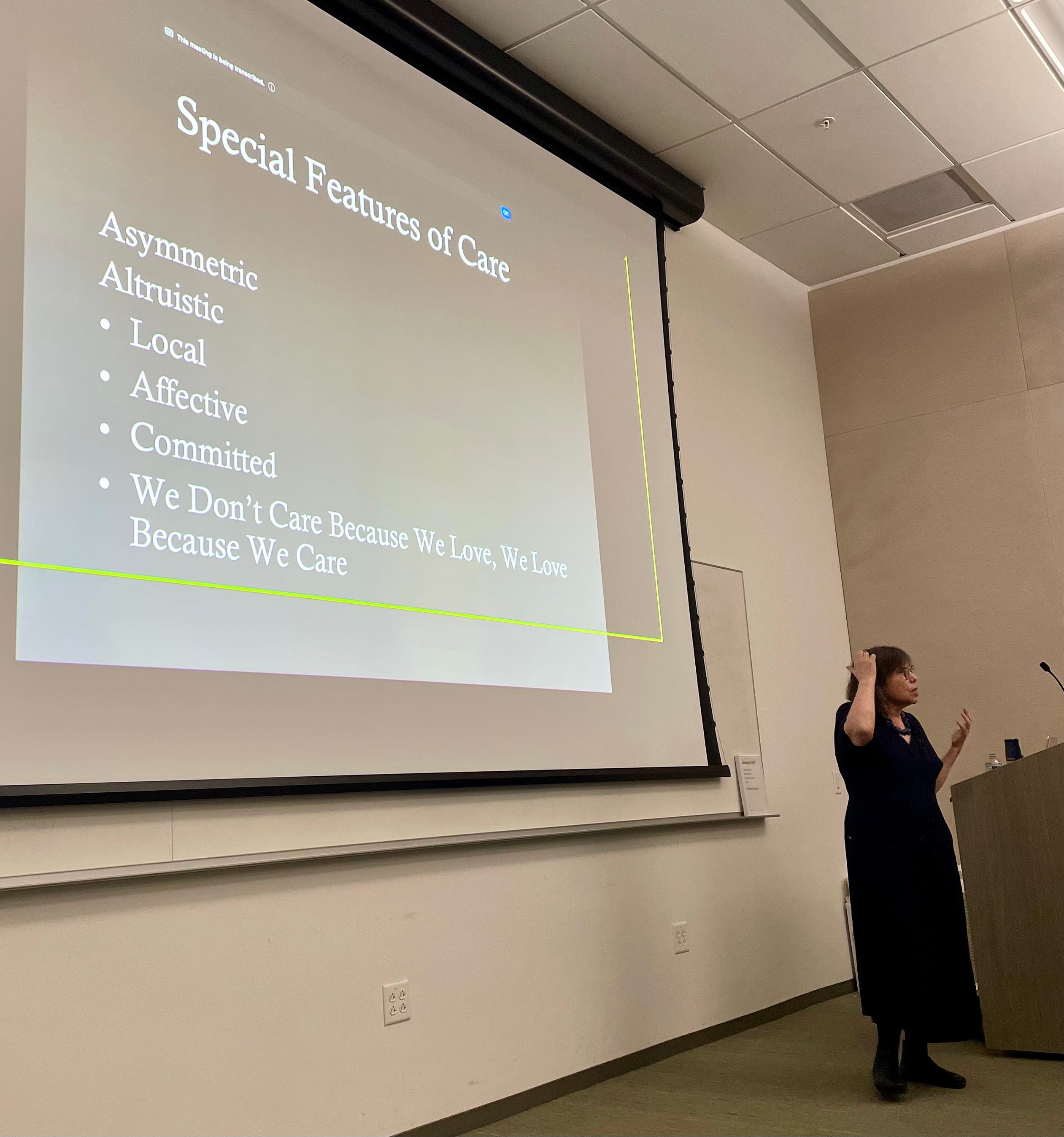 She suggested that since a caregiver is often drawn to completely subordinate their own personal well-being to the well-being of the one cared-for, then caregiving can cut against what a person otherwise cares about. But I see this simply as confirmation that caregiving is a particularly intense way of enacting the nature of care as such.