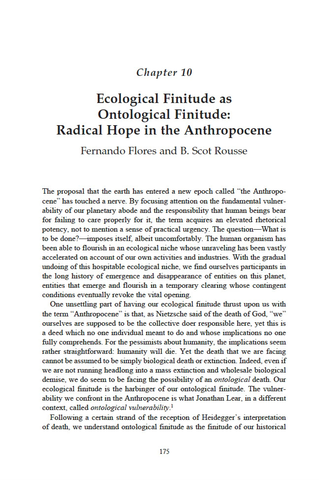 I adopted this notion of “radical hope” here from the excellent book by philosopher and psychoanalyst, Jonathan Lear. Radical Hope: Ethics in the Face of Cultural Devastation. This book inspired previous writing of mine with Fernando Flores: “Ecological Finitude as Ontological Finitude: Radical Hope in the Anthropocene,” which appears as ch.10 in a collection of essays called The Task of Philosophy in the Anthropocene.
